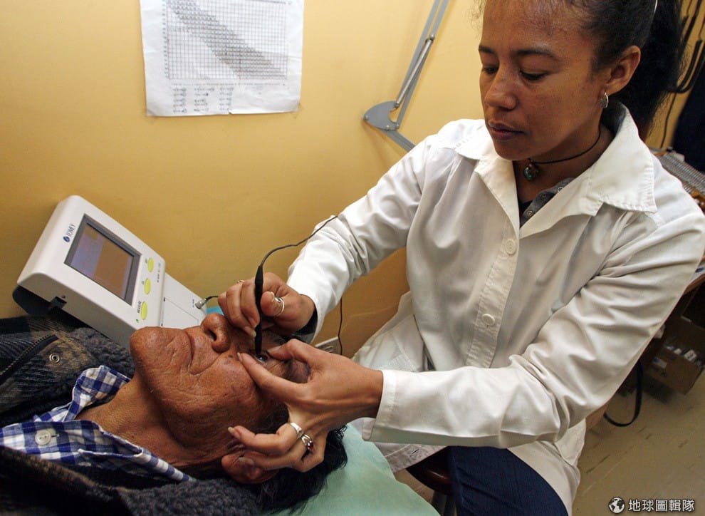 一名古巴醫生正在玻利維亞為病患檢查眼睛。