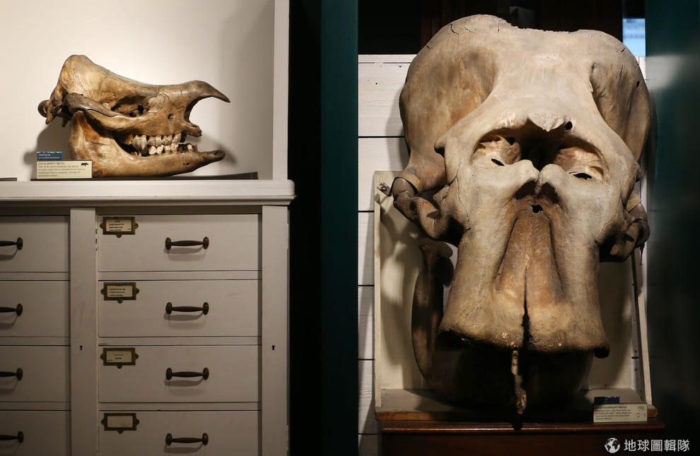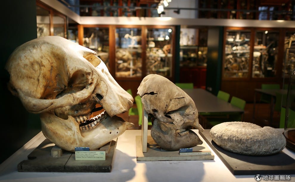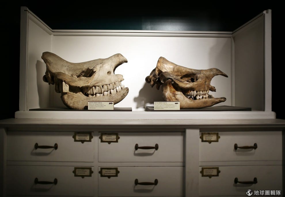 犀牛頭骨擺在亞洲象的頭骨旁,瞬間好小!Peter Macdiarmid/Getty Images
