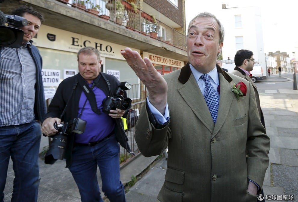 圖為英國獨立黨黨魁法瑞吉,他帶領的英國獨立黨主張英國退出歐盟,並反對移民入境。