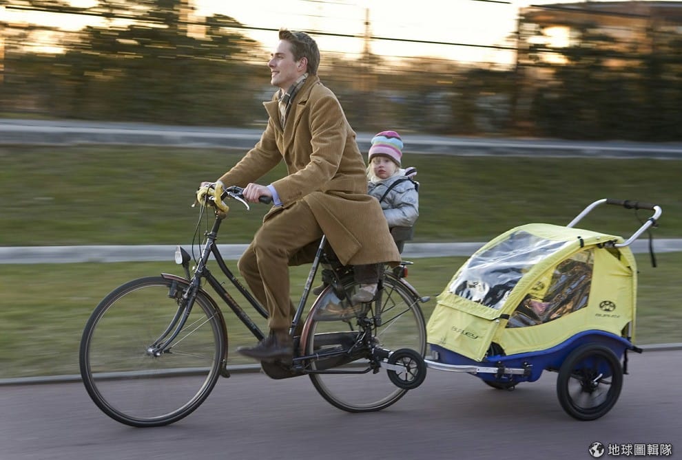 騎腳踏車載孩子的通勤族。