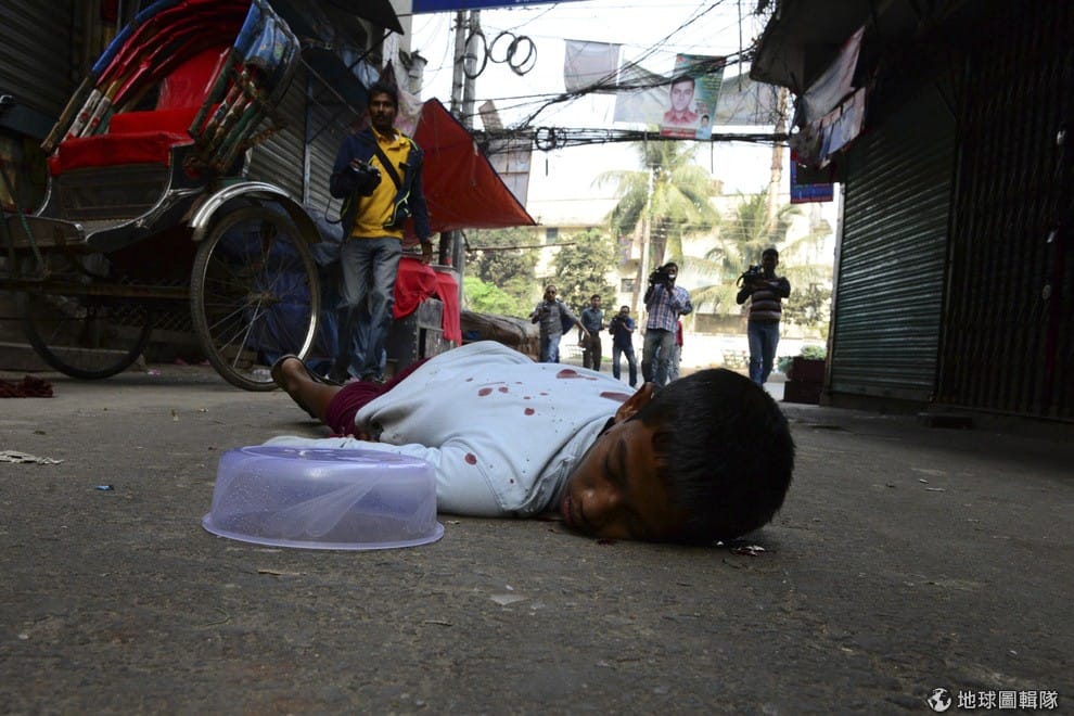 孟加拉以伊斯蘭信仰為主,多年來與伊斯蘭信仰相關議題的衝突不斷,圖為 2013年時,當地居民因為在 1971年犯下戰爭罪的伊斯蘭領袖該處死與否而引爆對立衝突,一名男孩受到警方子彈波及倒地。