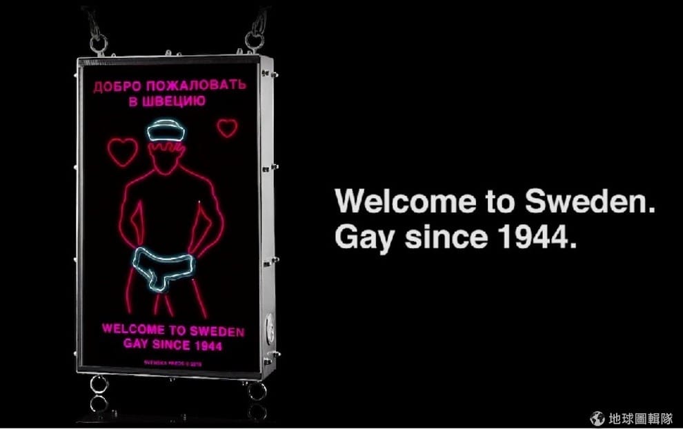 「唱歌水手」霓虹燈箱上的圖案也很吸睛,一個帶著水手帽的男子只穿著一條白色內褲,透過燈光的變化看起來就像是在搖動他的屁股,一旁還有桃紅色的愛心在閃動。燈箱上用俄文和英文寫道:「歡迎到瑞典。」最下面還有一排字「1944年就有同志」──1944年,瑞典將同性戀合法化。