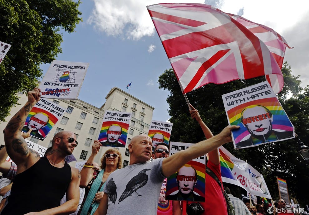 俄國2013年通過的「反同志宣傳法」引發各界撻伐,俄國政府的恐同立場也攤在陽光下。圖為英國同志團體聲援俄國LGBT族群,抗議俄國通過反同法。