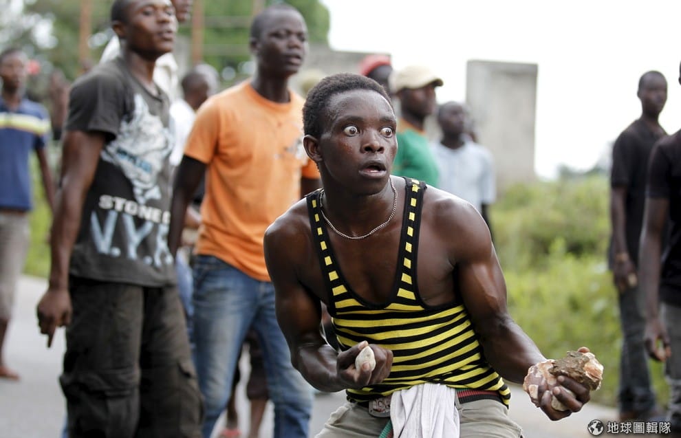 蒲隆地人民手裡拿著石塊,在街上和鎮暴警察對峙,場面一觸即發。
