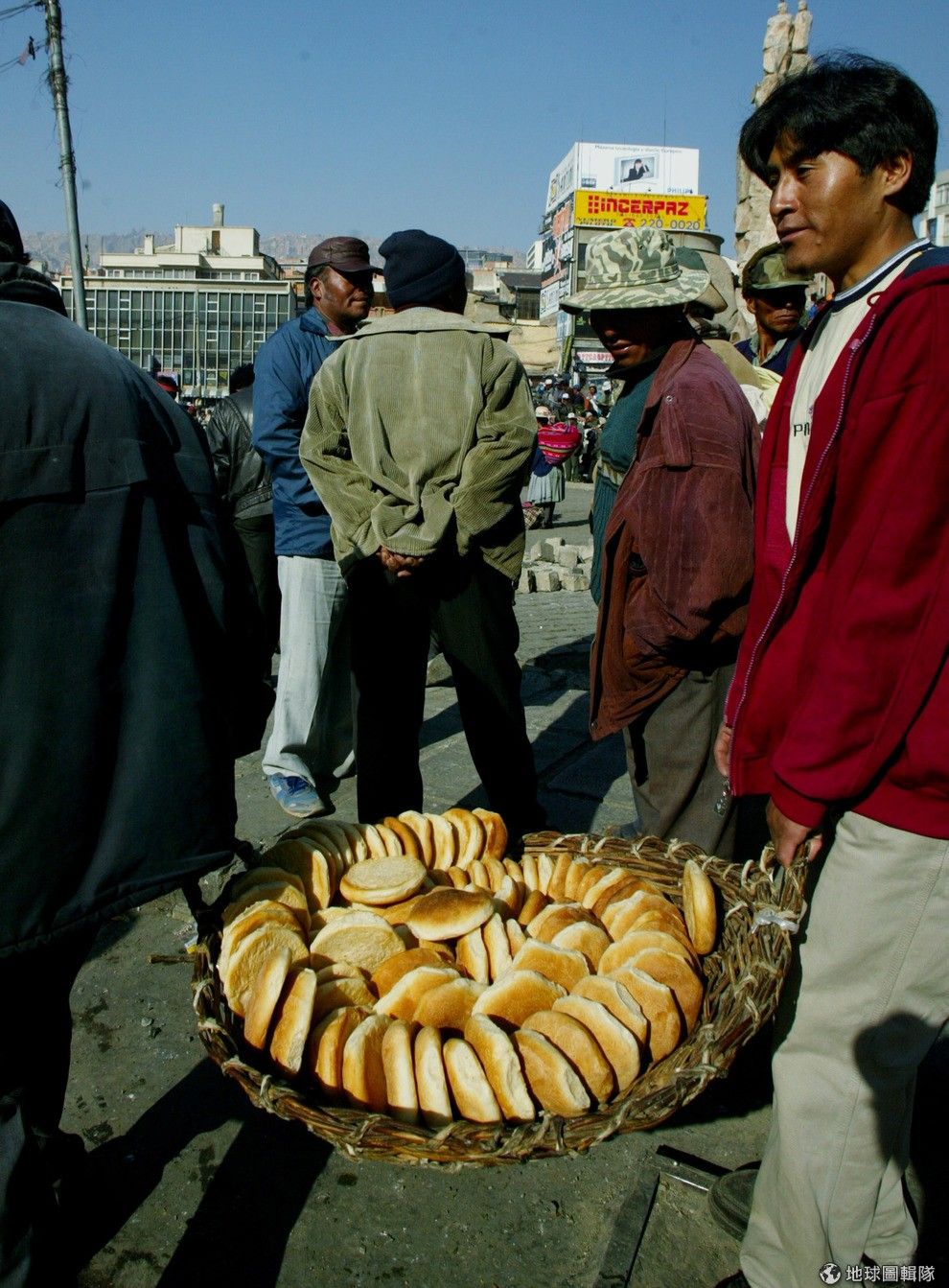 玻利維亞人抬著麵包到市場上去賣。以前麵包師都可以拿到小麥粉補助,現在政府決定要拿掉補助。