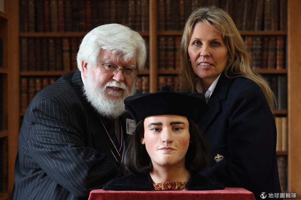 gettyimagesDan Kitwood「理查三世同好會」(Richard III Society)會長、以及一旁的蘭吉利女士與模擬的頭像合照。蘭吉利女士就是最先認為停車場地下有理查骨骸的發現者。