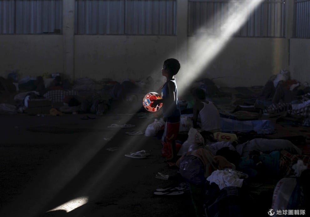 一名手拿著皮球的移民小男孩,站在蘭沙收容中心內。窗外的一抹陽光剛好灑落在他的身上,照出皮球上五花八門的國旗圖案,其他剛下船的移民歪七扭八地躺在地上休息。