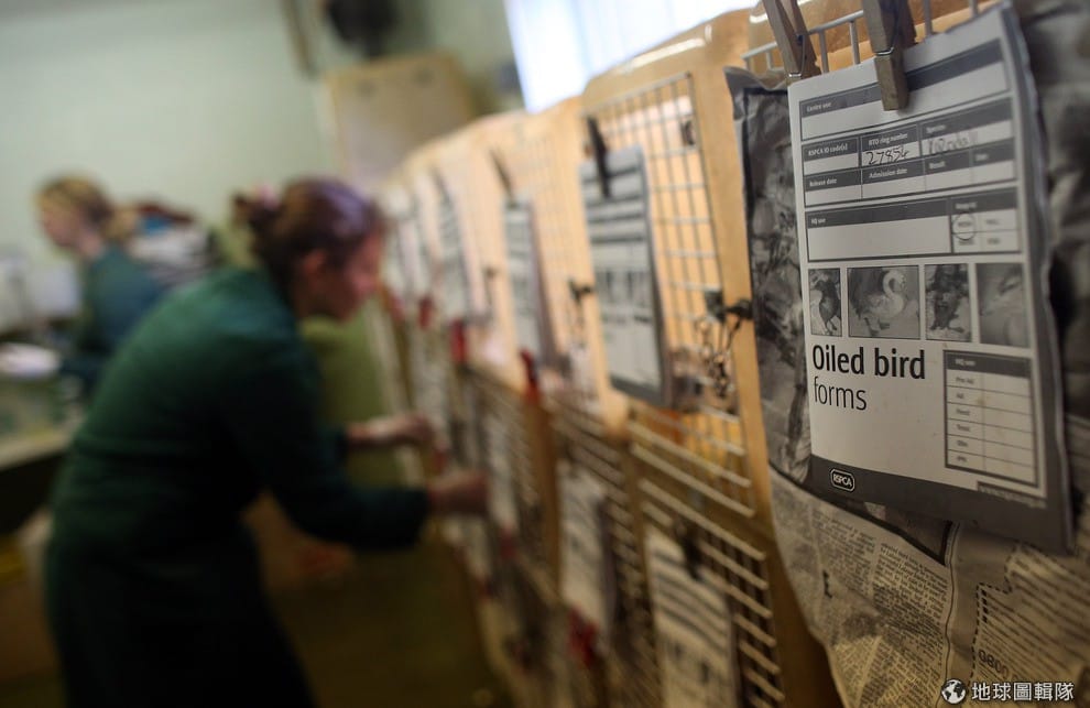 英國皇家防止虐待動物協會(RSPCA)的西部野生動物孵育中心(West Hatch Wildlife Centre),正在盡力搶救多隻被油汙影響無法飛翔的海雀。Matt Cardy/Getty Images