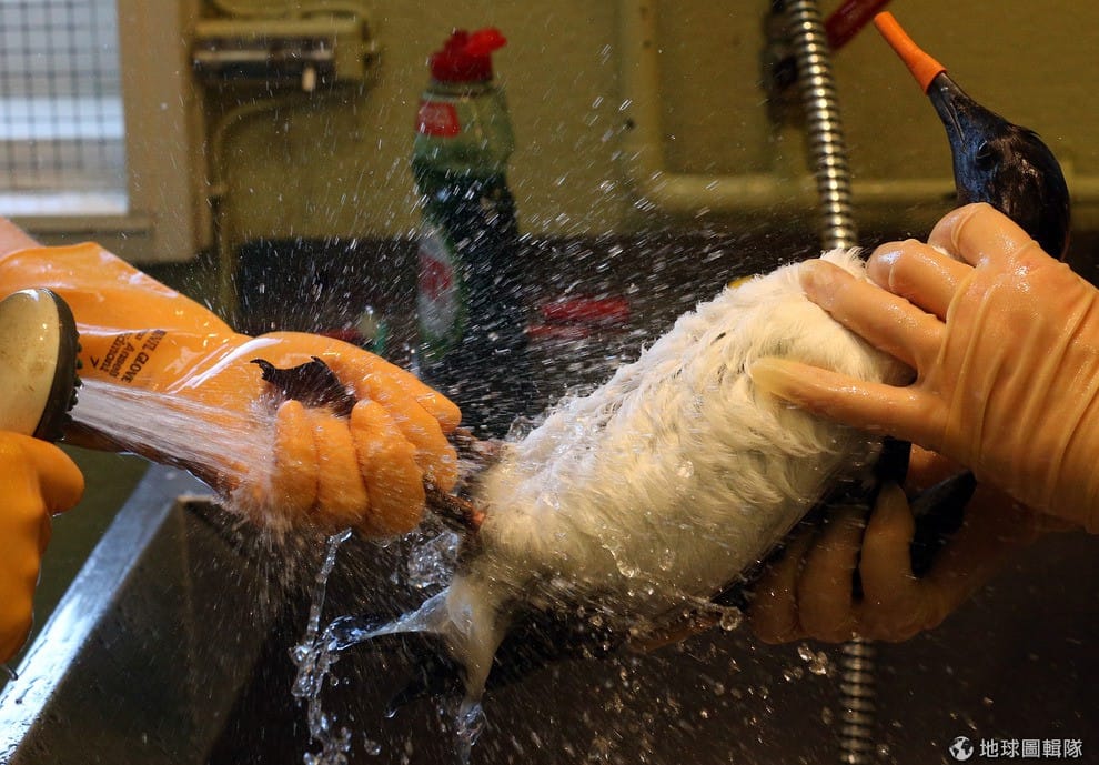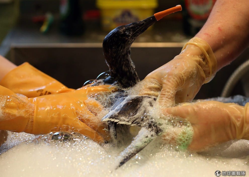 由於清水無法清除小鳥們身上的厚油,動保協會人員發現使用人造奶油(margarine)是比較堪用的清除方式,所以僅能先以這樣油膩膩的洗澡方式,來讓被沖上岸的海鳥們舒服些。