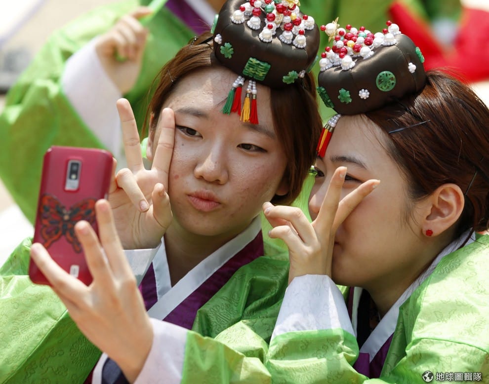 兩名穿著傳統韓服的女孩拿著智慧型手機自拍。
