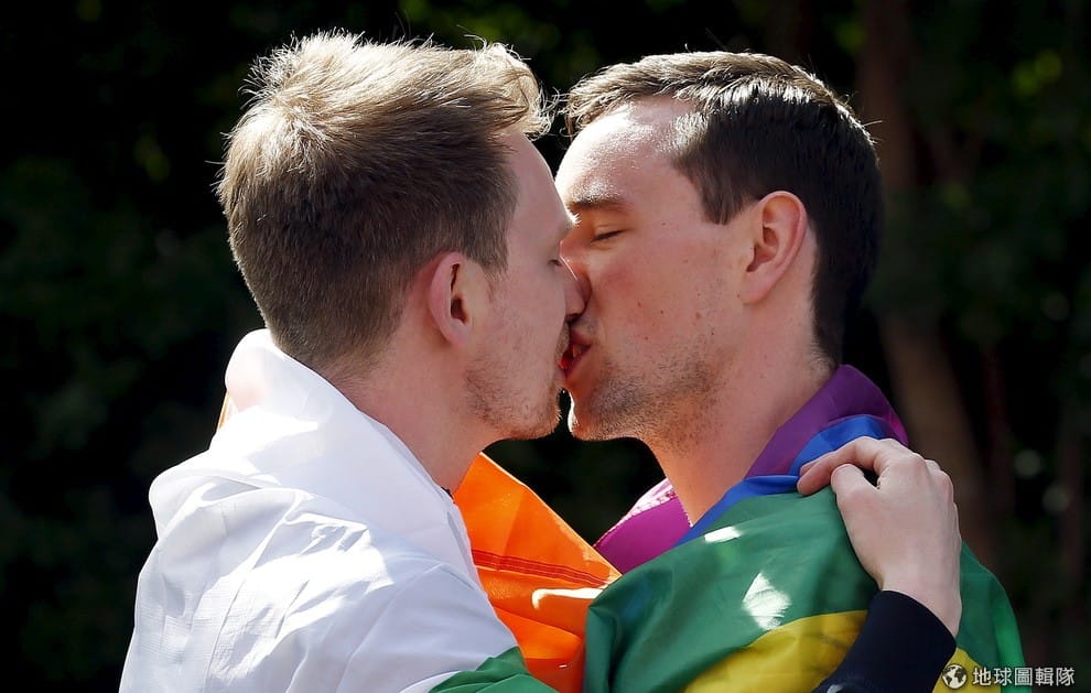 兩名同志在得知愛爾蘭公投通過後,深情擁吻。