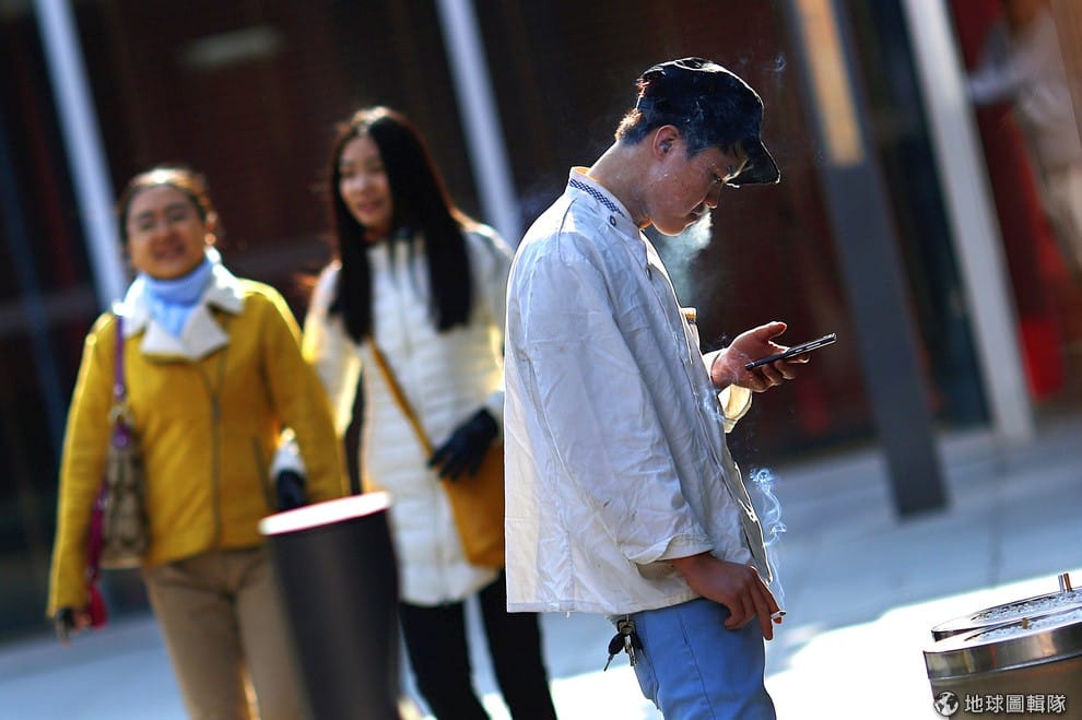 北京街頭上的青年邊抽菸邊滑手機。