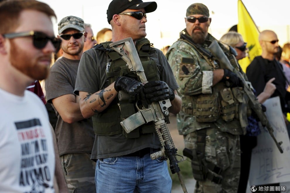 反穆斯林示威者中不少帶著槍,穿著迷彩服,誓言要奪回美國。