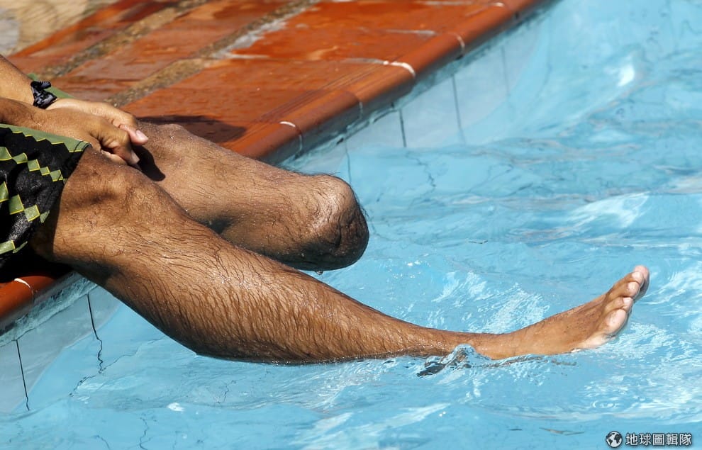 路透社因為地雷少了一隻腳的哥國軍人坐在游泳池邊。哥倫比亞是全球地雷第三多的國家,從 1990年到現在,已經有 11,000人因為地雷受傷或是死亡。