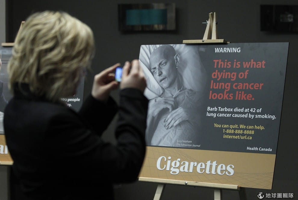 加拿大規定香菸廠商要在菸盒上放警告圖片,警告人們抽菸會得肺癌。