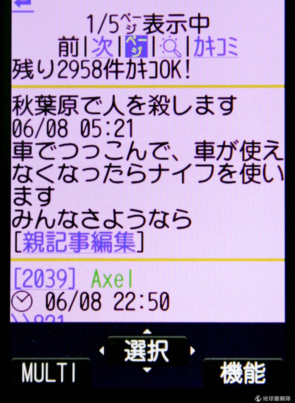 路透社加藤智大在犯案前,曾留下犯案預告,上面寫著「要到秋葉原殺人去,會用車撞,如果無法用車的話就會用刀子。大家掰掰。」