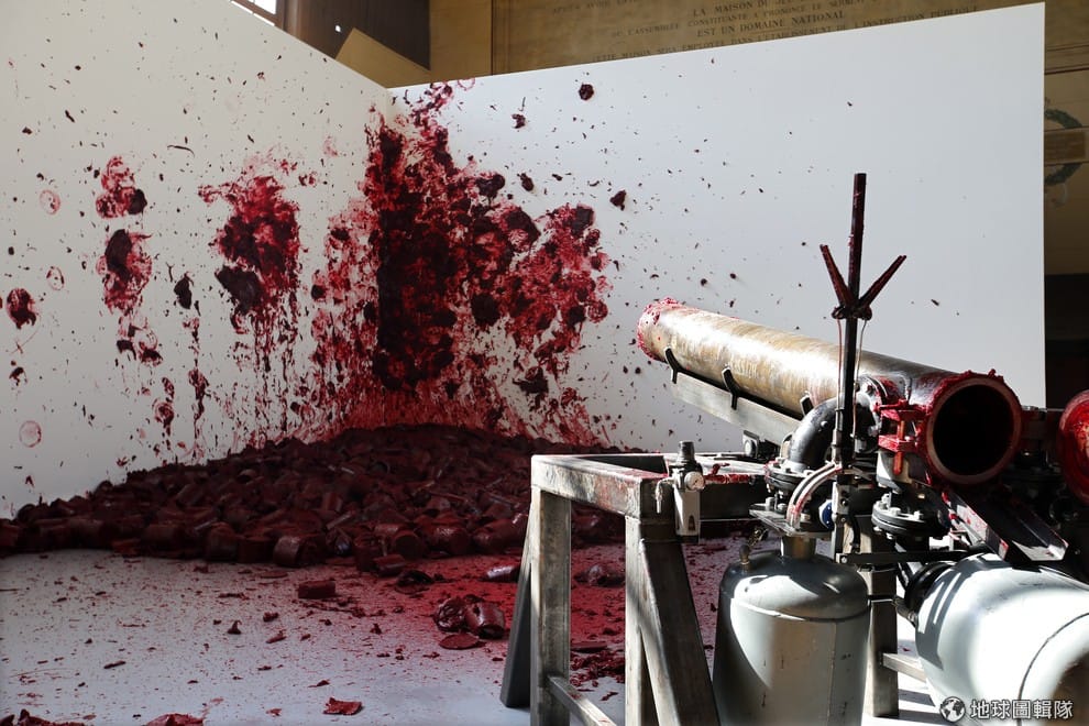 凡爾賽宮裡也有展出卡普爾的小型作品──一台加農砲朝著白牆射出紅蠟,象徵陰莖與射精。