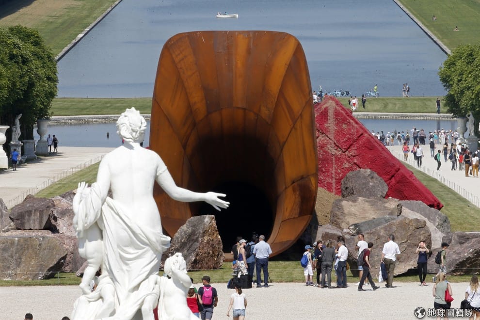 一群觀光客在卡普爾的作品前留影,背後富麗堂皇的凡爾賽宮也入鏡。