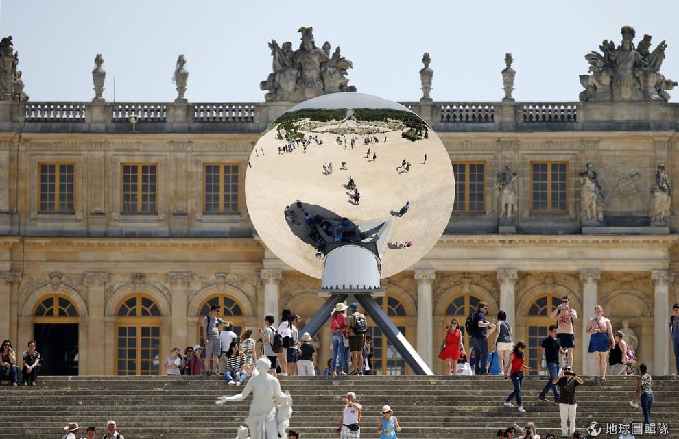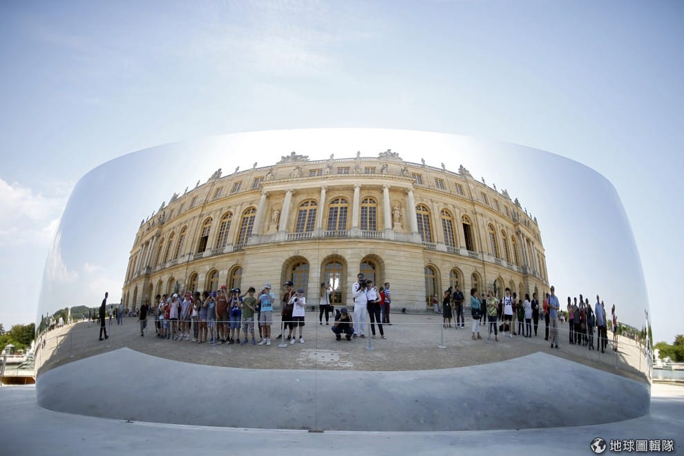 凡爾賽宮台階上展出卡普爾的作品「天空鏡」,遊客可以透過鏡子看見花園的反射。