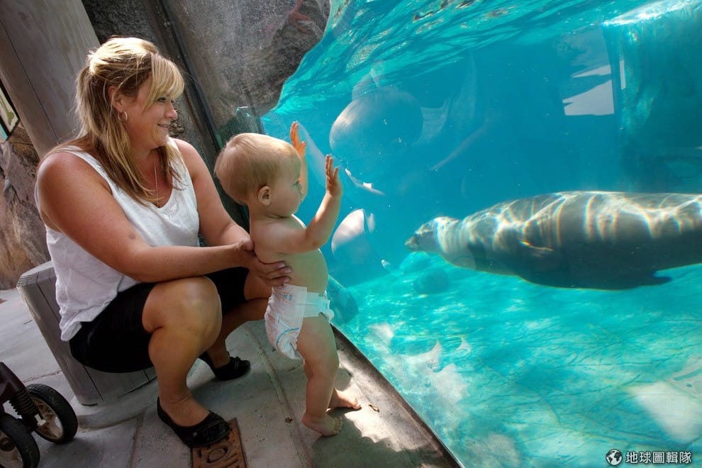 9個月大的小德瑞克,他正好奇地貼著玻璃和游來游去的海獅打招呼。Allison Shelley/Getty Images