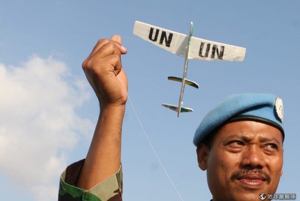 聯合國維和部隊人員都會帶著藍色的帽子,銀色的聯合國圖樣閃閃發亮。
