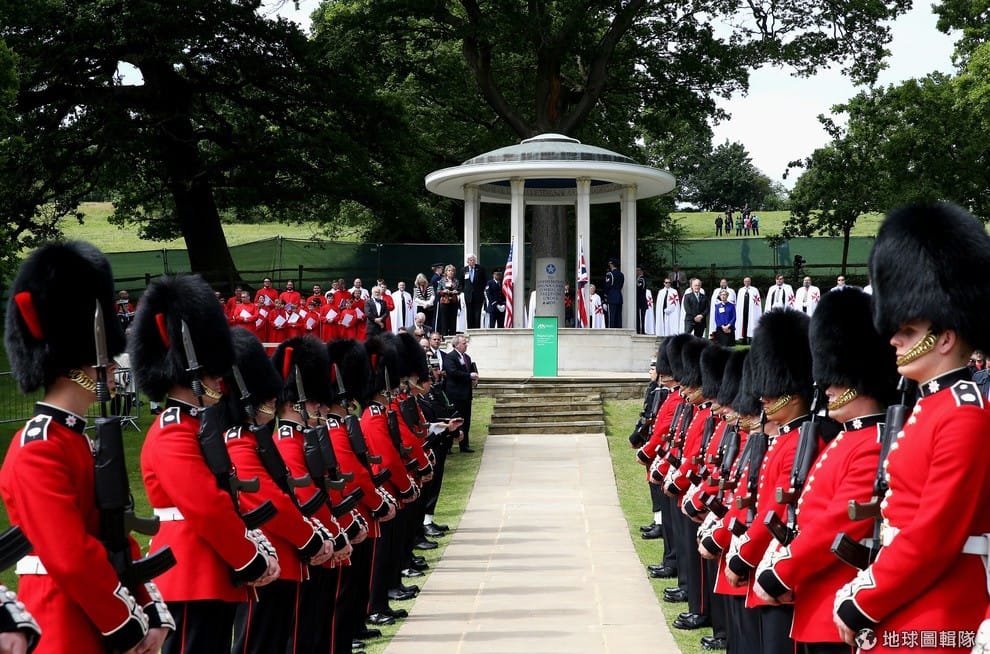 黑帽紅衣的英國士兵列隊歡迎貴賓前往中央的《大憲章》紀念碑致意。
