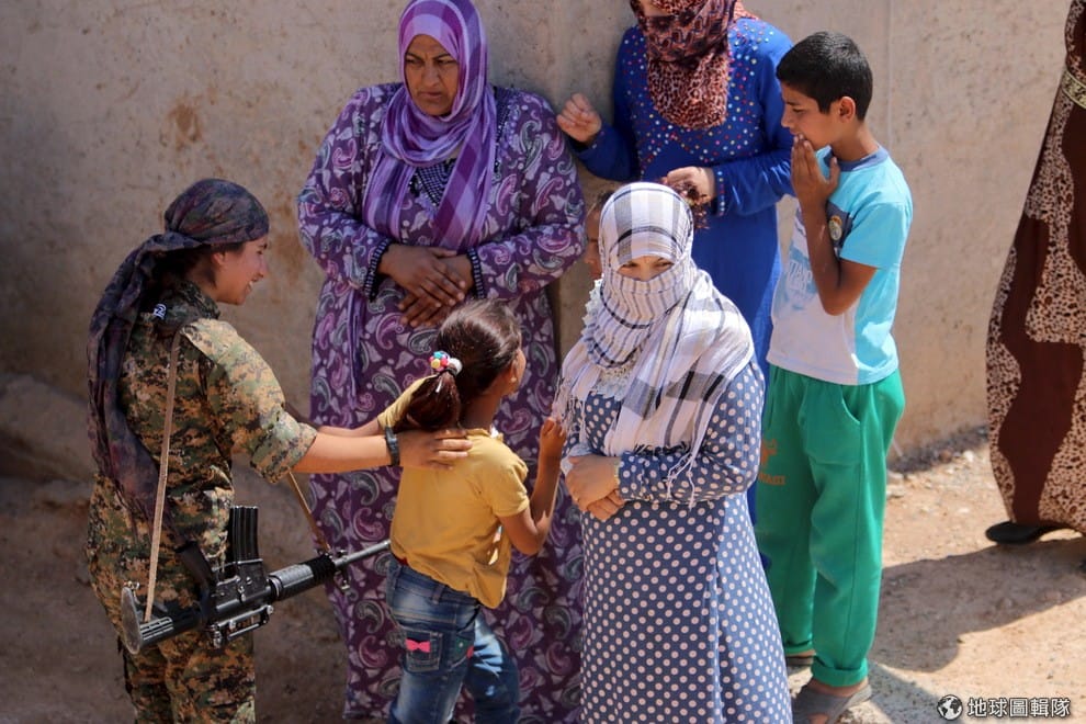 網友Wikicommons泰勒愛卜耶德鎮附近的村莊裡,庫德族戰士微笑站在民眾身邊。