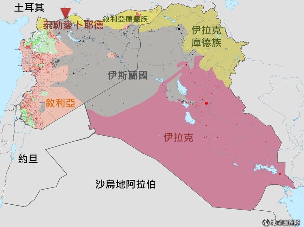 圖中的深灰色區域是伊斯蘭國的勢力範圍,紅色倒三角形就是泰勒愛卜耶德鎮,這個小鎮就在伊斯蘭國跟土耳其的交界點,可以說是伊斯蘭國的重要大門。Photo credit: Wikicommons;編譯:地球圖輯隊