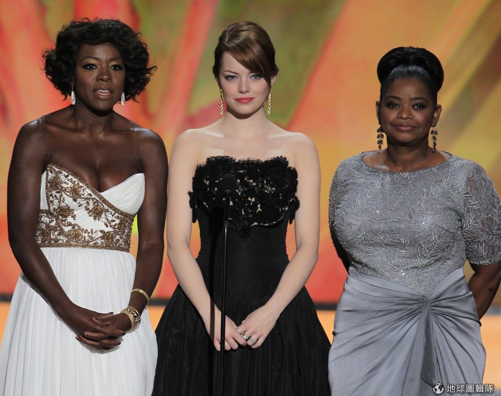 在過去的好萊塢電影中,黑人演員不只戲分少,演出的角色多受到歧視。圖為 2011年美國電影《姊妹》的三位主演──艾瑪史東(圖中)、薇拉戴維絲(圖左)還有奧塔薇亞史班森(圖右)。