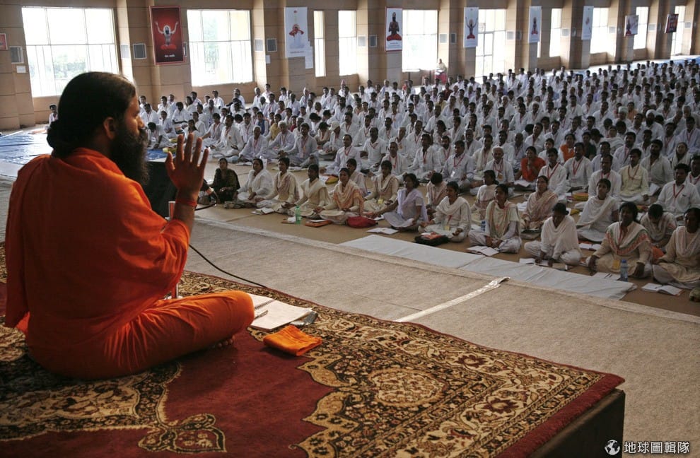 每年也有成千上萬的觀光客來到印度練瑜珈。圖為印度著名的瑜珈大師蘭德福(橘衣者),他正在對來自全球各地的學員講課。