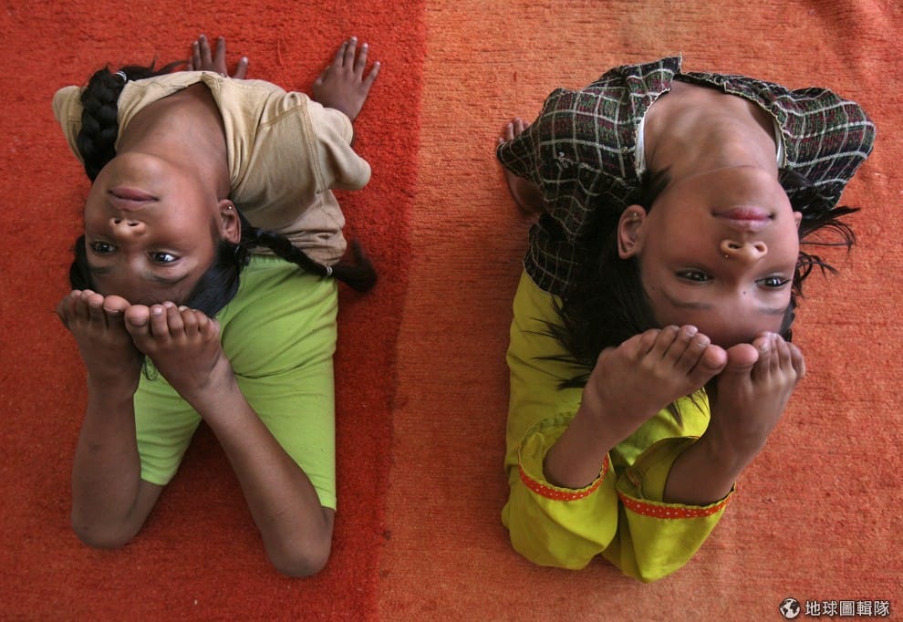 瑜珈是印度的文化象徵,不只對人體有益,還可以為印度創造經濟效益。兩名孩童正在練瑜珈。