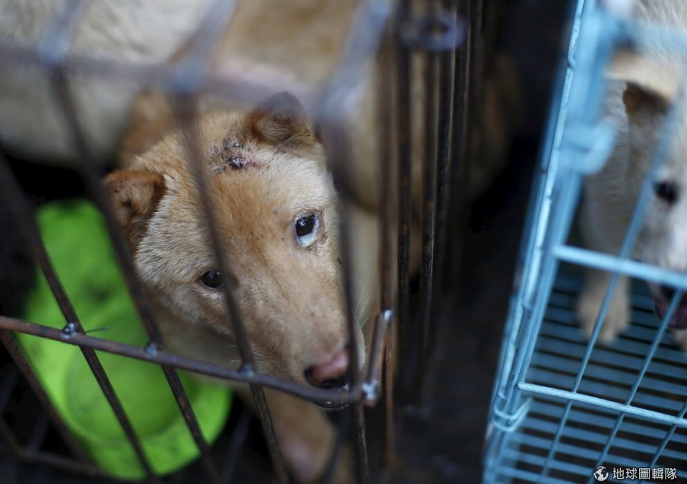 籠裡的狗狗睜著無辜的大眼,再過不久牠就會成為餐桌上的菜餚。