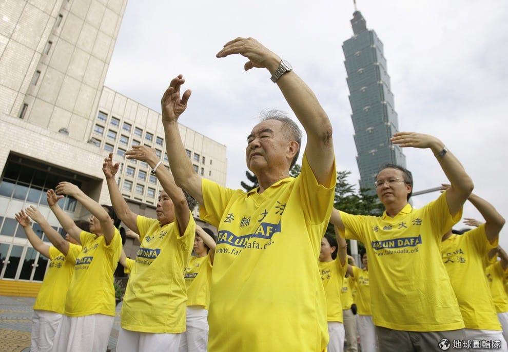 中國政府視法輪功為邪教,禁止人民在中國練法輪功。圖為法輪功成員在台北 101前練功。