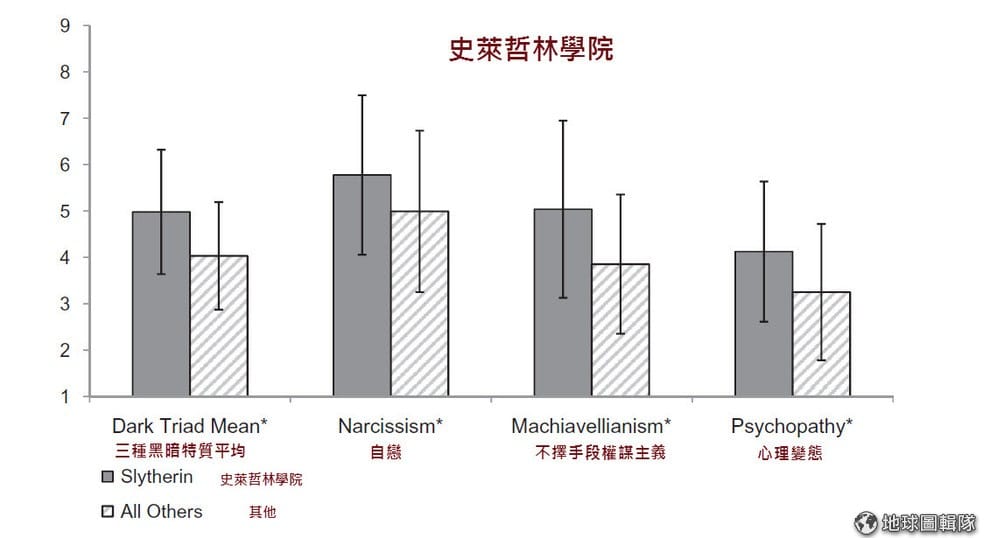 學者發現,被分類到史萊哲林的受試者,他們在暗黑三特質上的得分較其他學院學生顯著。
