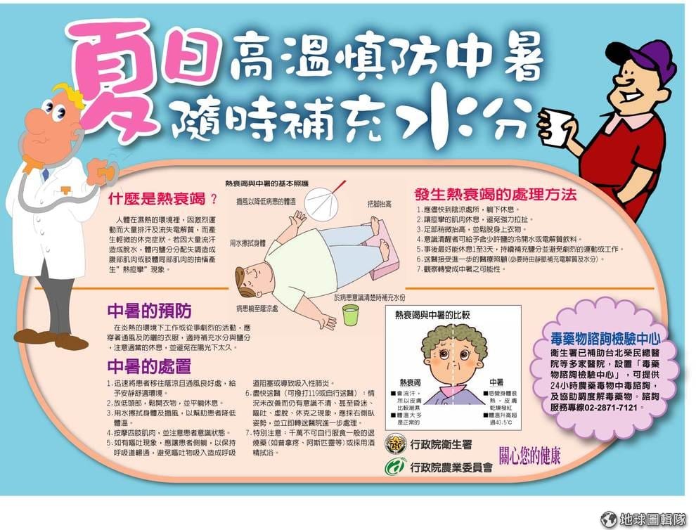 炎熱夏天,預防中暑要適時補充水分。圖為衛生署製作的中暑處理方式。Photo credit: 衛生署