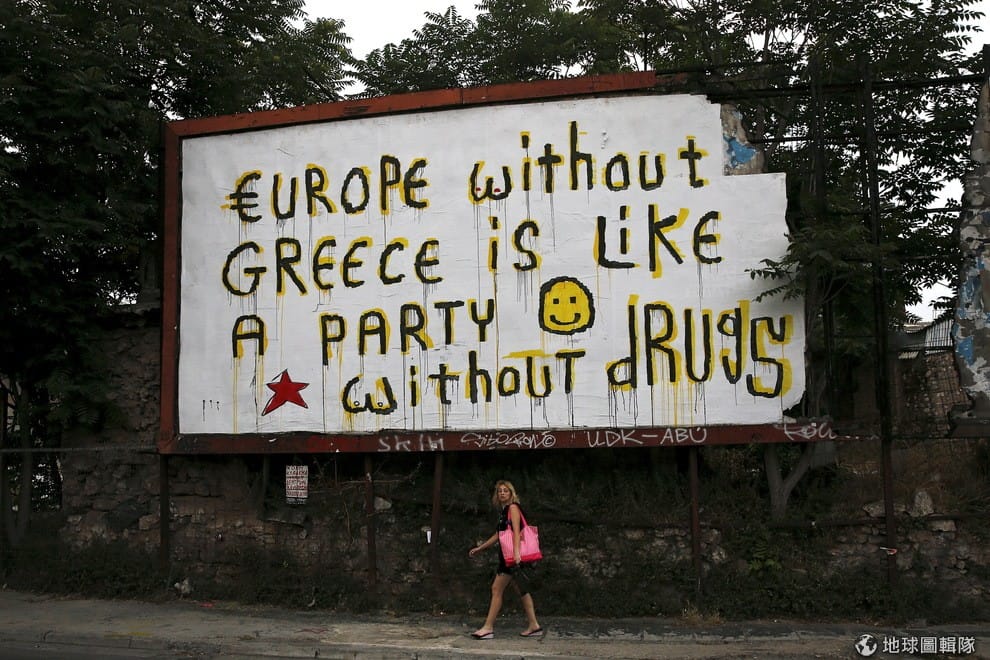 一名女子走過塗鴉牆,牆上寫道:「歐洲沒有希臘就像派對沒有毒品。」