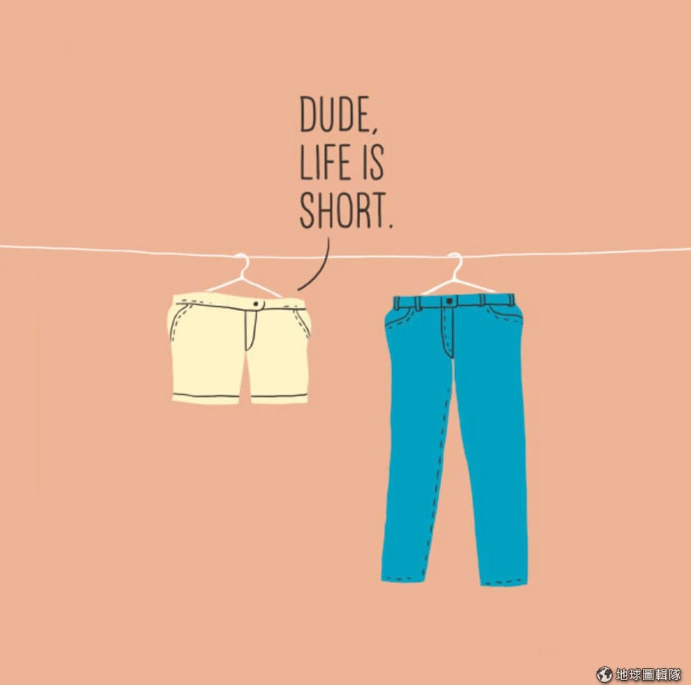 網友左邊的短褲(Short)對右邊的長褲說:「老兄,人生苦短(Dude, life is short.)。」Photo credit: 林行瑞