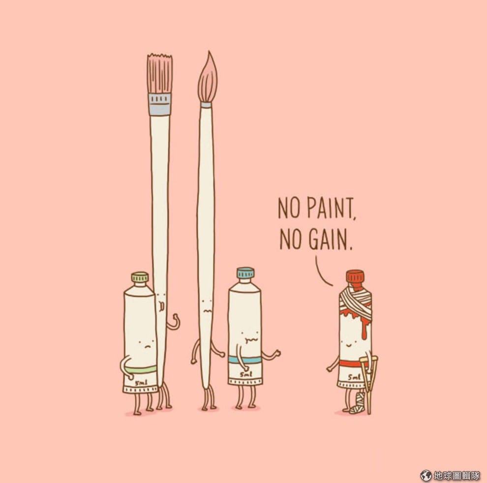 被用過的水彩塗料拄著拐杖對同伴說:「沒有畫畫就沒有收穫(No paint, no gain)。」取自英文一分耕耘一分收獲(No pain, no gain)的相似音。Photo credit: 林行瑞