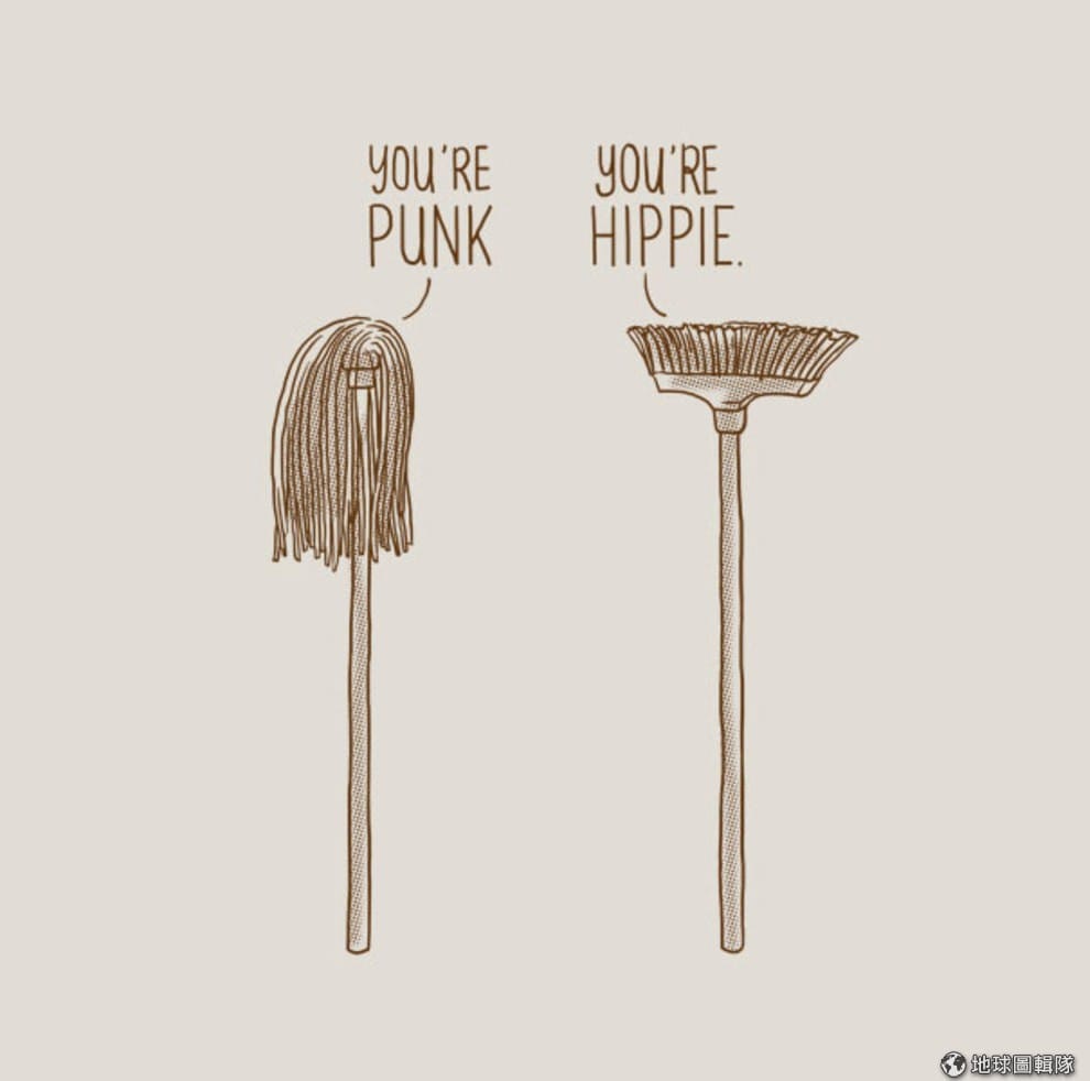 網友拖把對掃把說:「你是龐克(You're punk.)」掃把對拖把說:「你是嬉皮(You're hippie.)」Photo credit: 林行瑞