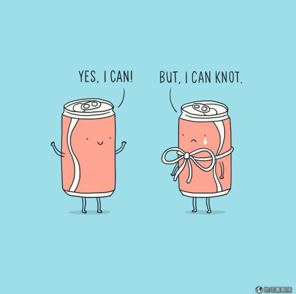 網友兩個汽水罐在聊天,左邊的汽水罐(can)說:「Yes,我可以(I can.)!」右邊的汽水罐腰上綁了個結(knot)說:「可是,我不可以(I can knot.註:為 I cannot的諧音)。」Photo credit: 林行瑞