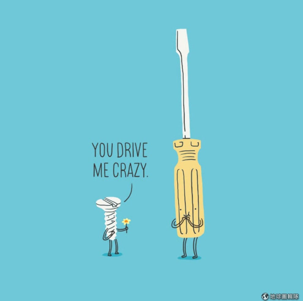 可愛的小螺絲釘對螺絲起子說:「你讓我神魂顛倒(You drive me crazy)。」螺絲起子的英文為screw driver。Photo credit: 林行瑞