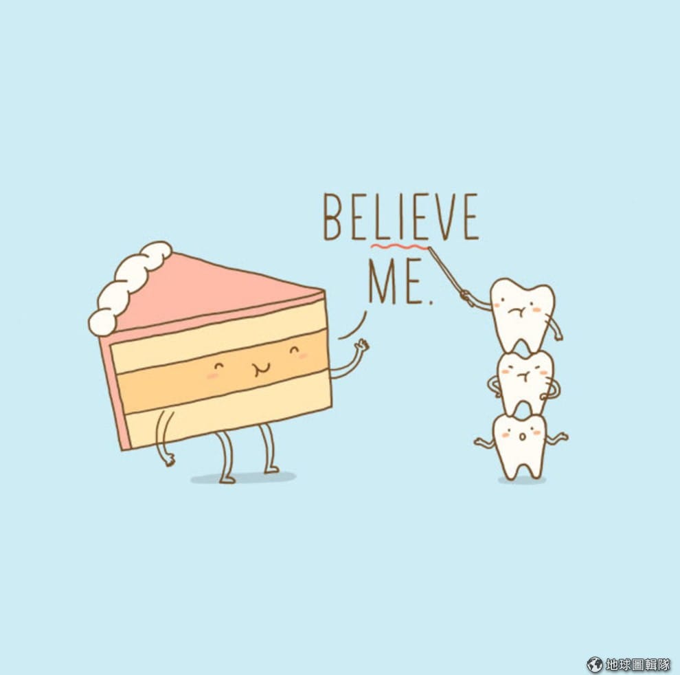 蛋糕對著牙齒說:「相信我(Believe me.)。」牙齒馬上戳破蛋糕的謊言(Lie)。Photo credit: 林行瑞