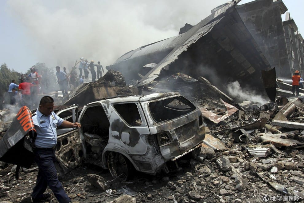印尼空軍的軍機在起飛後不久,墜毀在民宅裡。