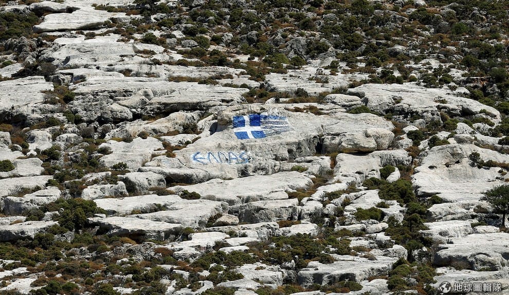 希臘的「卡斯特洛里佐島」上,有民眾把希臘國旗塗鴉在岩石上,這座島嶼在 2010年時,曾是前任希臘總理巴本德里歐(George Papandreou)宣布希臘「需要紓困措施」的地點。