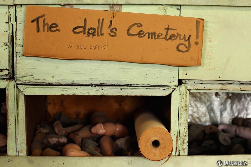 小小看板上寫著「娃娃墓園」,下方還有小字「我們討厭芭比!」。Mark Kolbe/Getty Images