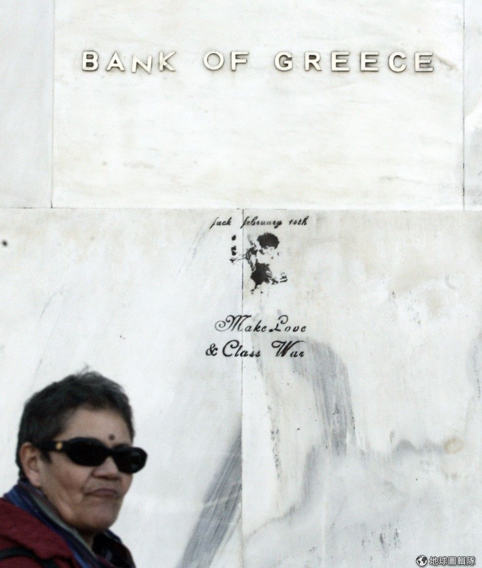 gettyimages在希臘銀行的大門上,塗鴉寫著「Make love & Class War」。Milos Bicanski/Getty Images