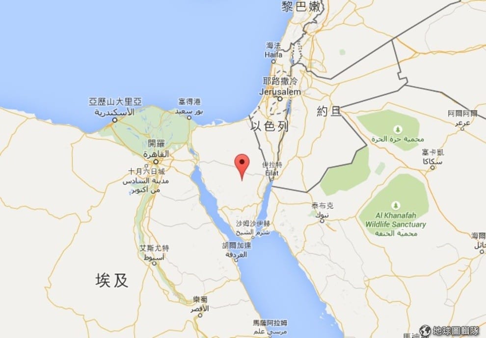 圖中紅點所在的三角形區域即為埃及西奈半島,戰略地位重要,埃及政府軍與伊斯蘭激進分子衝突不斷。