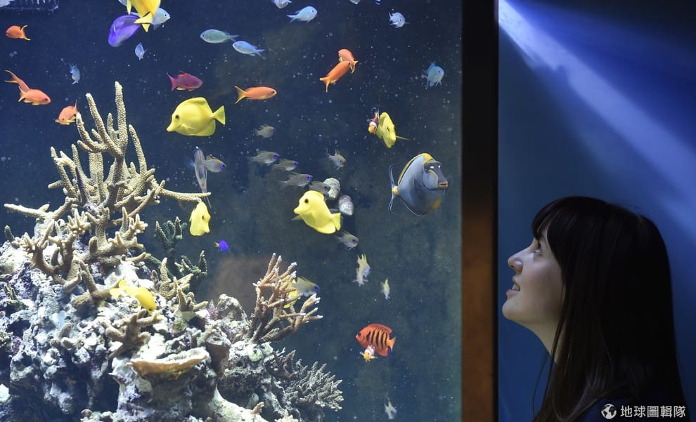 一名女子正在參觀水族館,水槽裡的魚兒五顏六色非常吸睛。