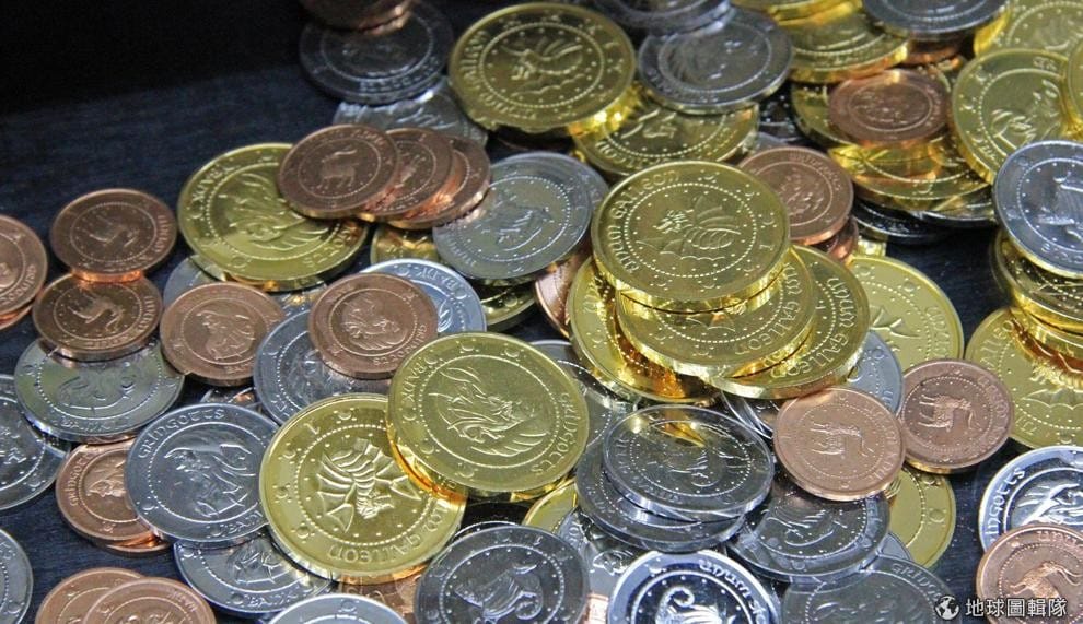 圖為《哈利波特》故事中所使用的錢幣,金加隆、銀西可和銅納特。Photo credit: Karen Roe