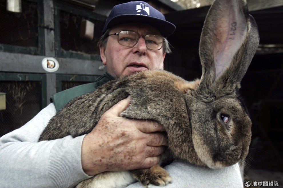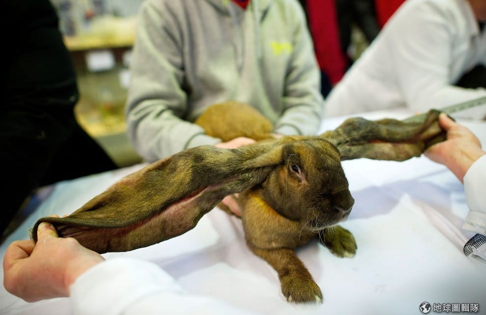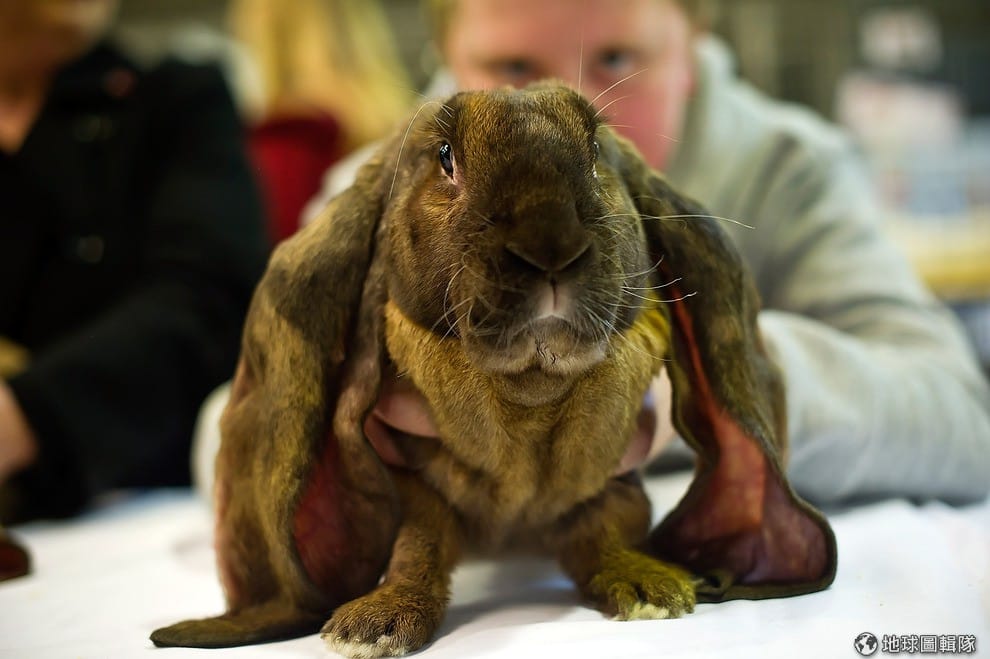 德國有隻叫「羅伯」的大灰兔,正乖乖地被主人抱著。這隻灰兔重達8.5公斤、耳朵有25.5公分長喔!Sean Gallup/Getty Images